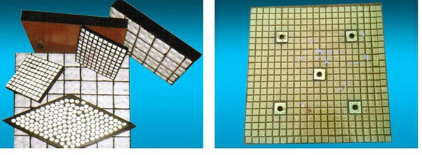 通過橡膠硫化技術,將馬賽克陶瓷鑲嵌在特種橡膠內,構成方形陶瓷橡膠復合體,在依靠焊接(三合一系列)或者高強度粘結劑黏貼(二合一)方式固定在設備的防護面上,形成堅固且有緩沖力的防磨層,較大的拓展了氧化鋁陶瓷的使用范圍。產品廣泛應用于火力發電廠的輸煤、排灰系統及冶金鋼鐵業的輸料、配料料倉、料斗等設備,有效的解決了因物料落差大,沖擊力強,導致配料輸送系統使用壽命低的問題;同時,陶瓷橡膠復合襯板能扭曲、劃割,適應于各種異型設備的安裝。
